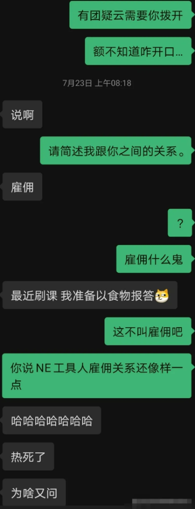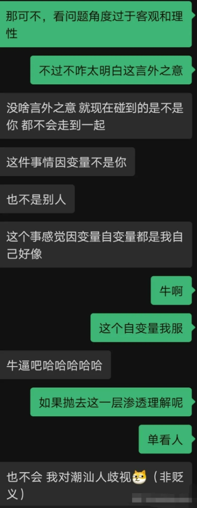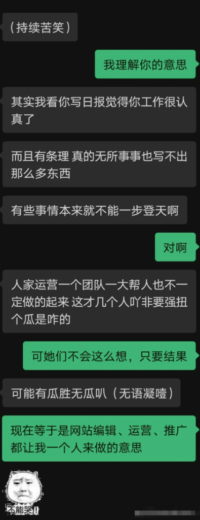 各抒己见之后,我好像找到了队伍一般,也就是从那个时候开始,她以线人的身份探听公司一切情报,然后毫无保留分享给我,我也是从那时候感觉公司的冷血以及被倾诉的一种舒适感。无论是自己的职能被架空的那种无力还是顶头默默对我进行不利的操作,在那一天所有的阴霾都因为这场对话而慢慢拨开:就那天,聊着聊着又回到最开始: