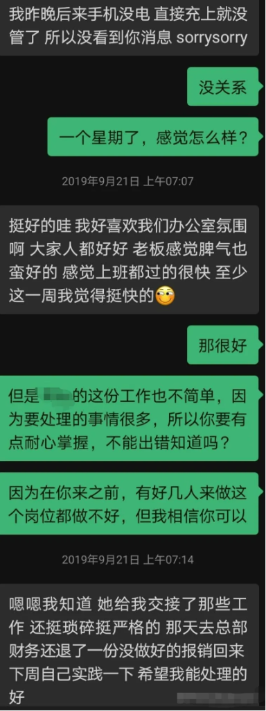 后来因为她离我老大的位置很近,我就借着便宜问了点那天的事(大概意思就是公司开走了我部下的一个实习生,然后问看法之类的):