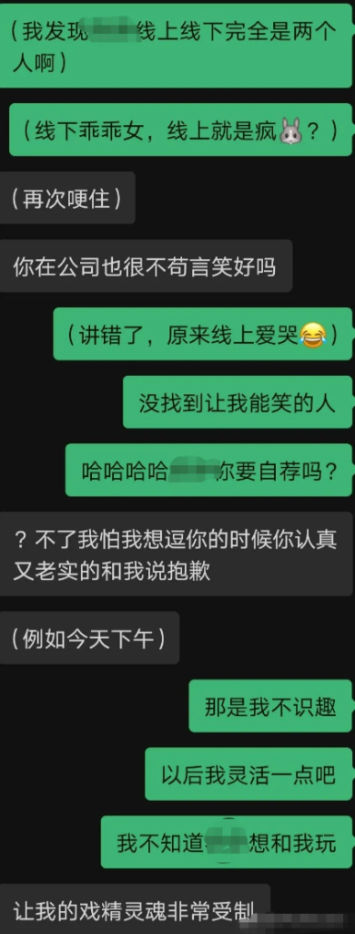 我比她虚长一岁,是在同一个单位同一个部门工作。她虽然年轻,人情世故却不是那个年纪该有的。面对面交谈时,她可能收着性子非常谨慎地回答你,而当你们转向网络,去线上聊天时,除了各种恰如好处的表情包攻击,还会一些05后的说话方式,正经和沙雕来回切换,就完全是两个人。