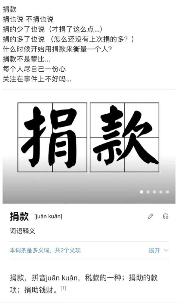 在这些闹剧发生以前,大家对于灾情的态度很清楚,有钱出钱,有力出力!如果不是公众人物转移目标,大厂打响的捐助内卷之争只怕会很好看。而明星带头捐款,有实力的艺人捐100万,有爱心的艺人捐50万,有流量的艺人捐300万甚至更多,本来形势一片大好,突然大家就注意到了上述几例,给到他们的感觉就是一致的: