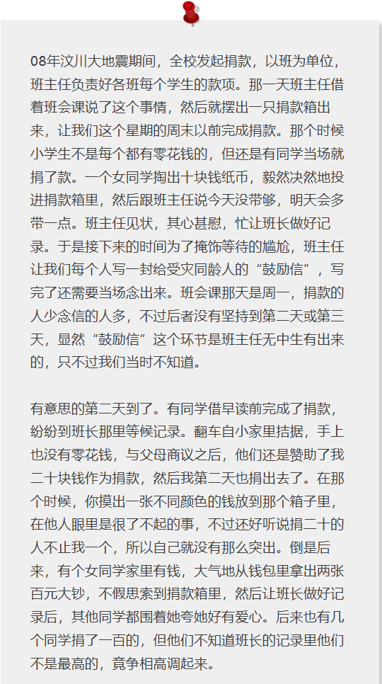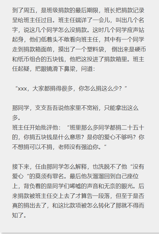 想到这里,翻车不觉呀然一惊。心说我们在网络上看企业和明星捐款的竞争,原来早在自己小学时候就已经体会到了。和以前一样,我们仍然看不到我们捐献出去的“爱心”将如何落地,我们的贡献出去的“绵薄之力”是否得到回应,比起募捐箱的容量,我们更关心自己的援助是否得到了证实,可大部分结果是,我们只是充其量做了一回善良的人,而这份善良又是不可昭告于天下的,或者被集中起来包装成了某种名义。捐款这个事情其实非常脆弱,因为一旦高调起来,人的初心就会变质,那我们所有的“善举”都变成了换取利益的遮羞布。
