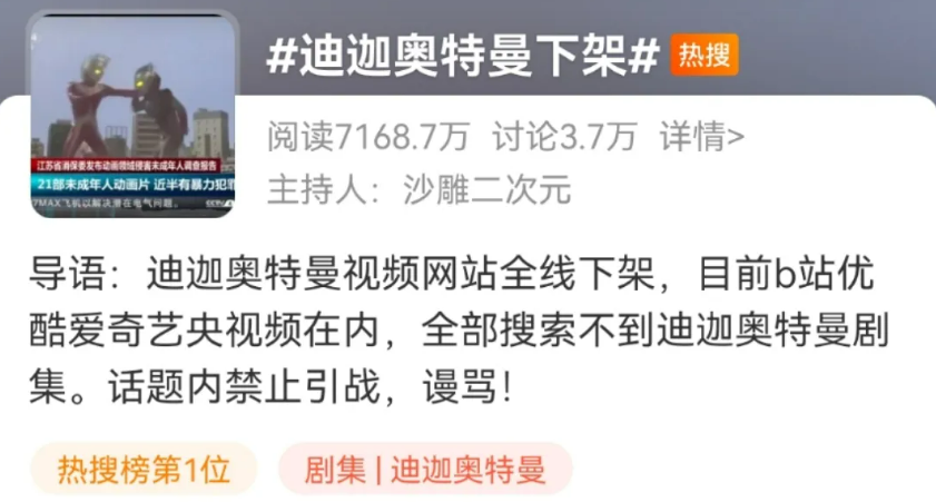出于此类信息的敏感意识,我马上翻看手机,果然我看到了#迪迦奥特曼下架#的话题热搜。