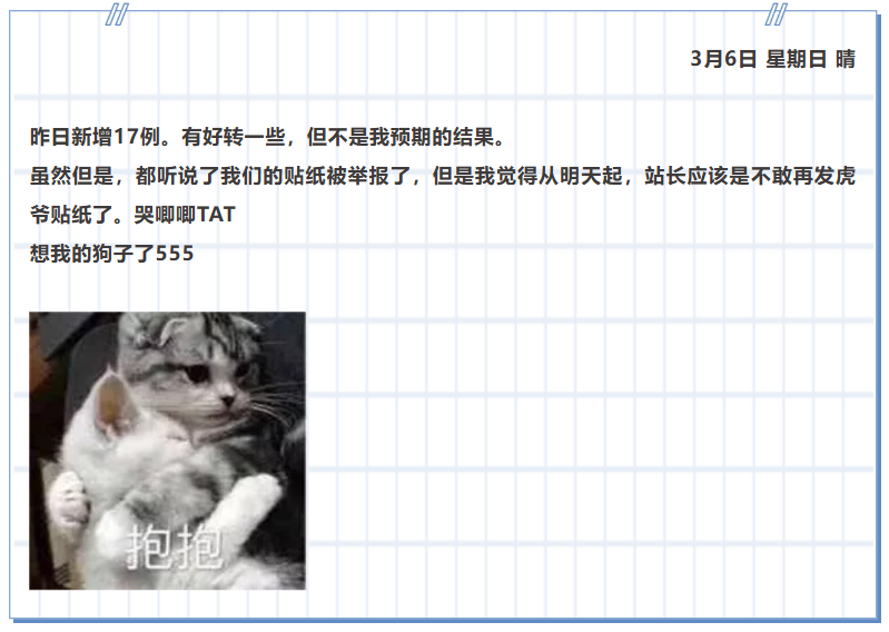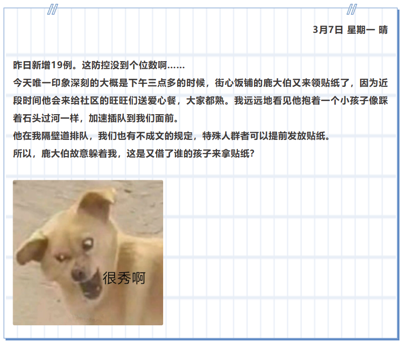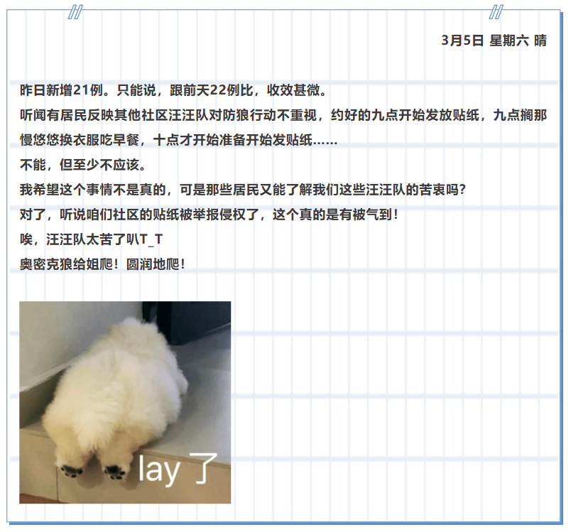 【前情提要】原本安宁祥和的森林突然遭遇外族野狼入侵,森林某社区的象站长为抵御野狼,号召大家在脖子上贴上虎爷贴纸。而后为了更快将防狼意识普及到社区全部的森林居民,象站长利用巧思让全体居民都迎合了他的防狼政策。就在全民防狼常态化的时候,防狼先锋的汪汪队们,不时会遇到一些很闹心的事情,其中一个汪汪队成员小汪,就在工作之余把她的抗疫(局部)日常记录下来了: