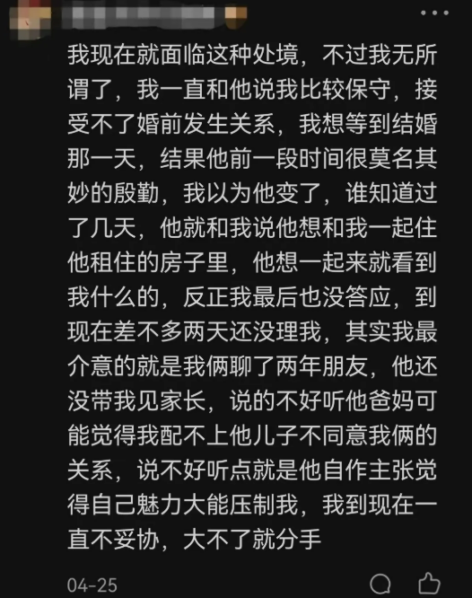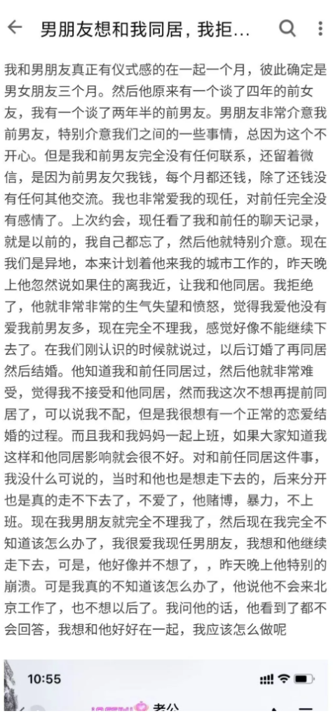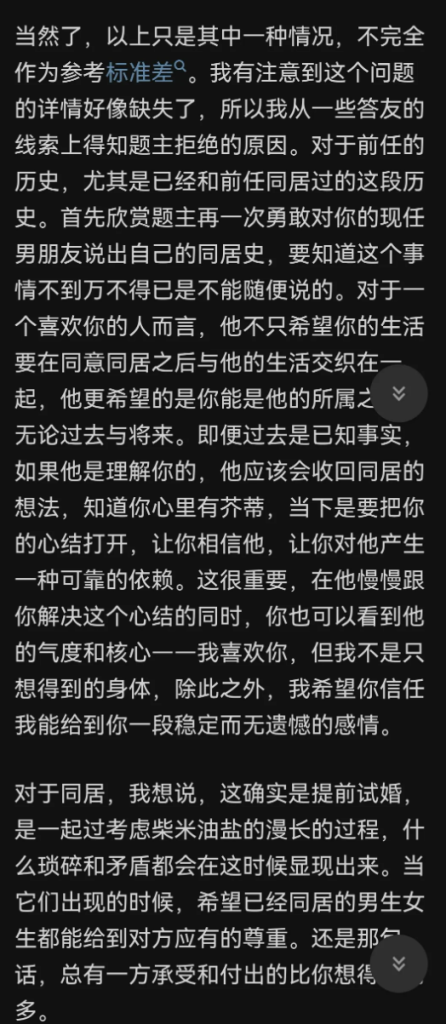 关于这个问题,说起来还有些敏感:帝都女题主,也是本次事件的苦主,说自己因为男友想跟自己同居然后拒绝了,现在他们关系很僵,好像不能继续在一起了,于是来找网友求助答案。 如果这个问题的已知条件只是这样普普通通,那它就是个很平常的情感纠纷,而这个问题有意思的地方在于苦主扩充的问题详情,不过我没看到,可能出于什么原因隐掉了。大概是这样的: