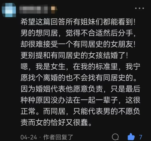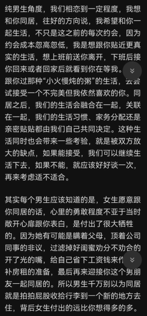 话说回来,这个问题往往是女生才最有发言权,我在回答里就说过,她们同意跟男生同居,一定是顶着某些压力的,所以女生的每一次投怀送抱都是有分量的,她们相信自己的男朋友能够与她好好生活,一起把两人的小窝打造得既有规划也有温度,不时两人脑袋贴脑袋一起畅想未来……;反观男生,他啥也不想啥也不顾,以为就是自己的人和行李过去了一个新的地方,每天睡前醒后可以看着她,无偿抱着她,有时候还会不顾她的感受要他满足,结果就是两人吃也吃了睡也睡了,他解了姑娘的衣服却没有为她披上婚纱,她等不到他许下的承诺,等不到他突然庄重对她示爱,等不到他帮她带上指环,甚至还言之凿凿说我们还是不合适,祝你以后遇到比我更好的这种渣男发言。我真是百看不厌也百吐不厌。