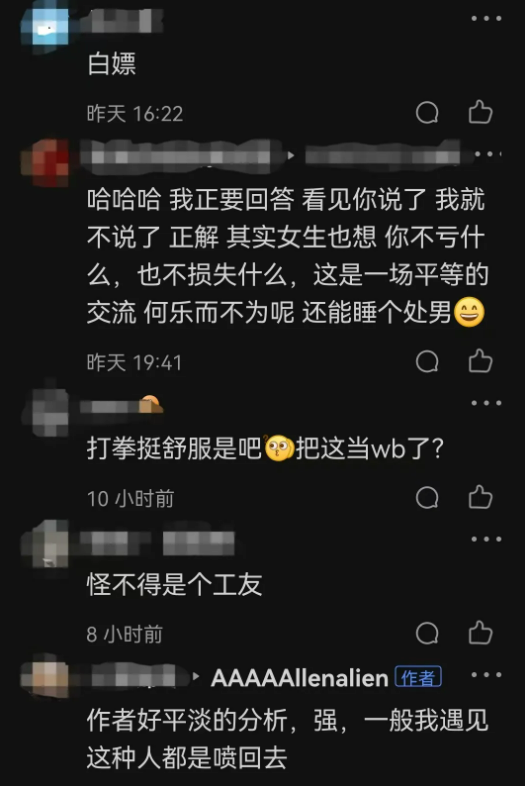 即便他们对我毫不客气进行了谩骂,但出于职业道德,我还是不会曝光他们的信息。至于剩下的基本都是骂我怼我说我蝻搞性别对立,千篇一律我觉得没啥意思就不一一放出来了。哦对了,面对这样的情况,我也不完全是沉默的: