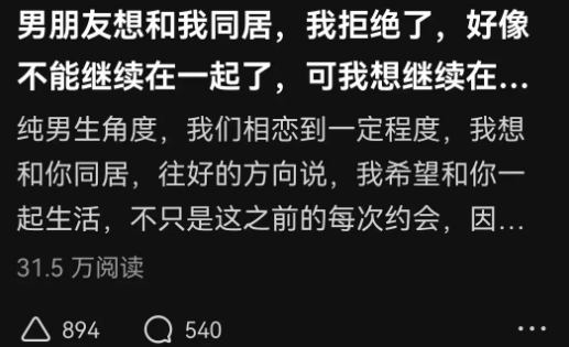 希望提出同居想法的男生们,去想想将来如何在只有你们两个人的空间下,更好地保护她,尽管她会出现你们约会时看不到的一些真实景象,你也要用你的臂弯和肩膀去接纳她和包容她。